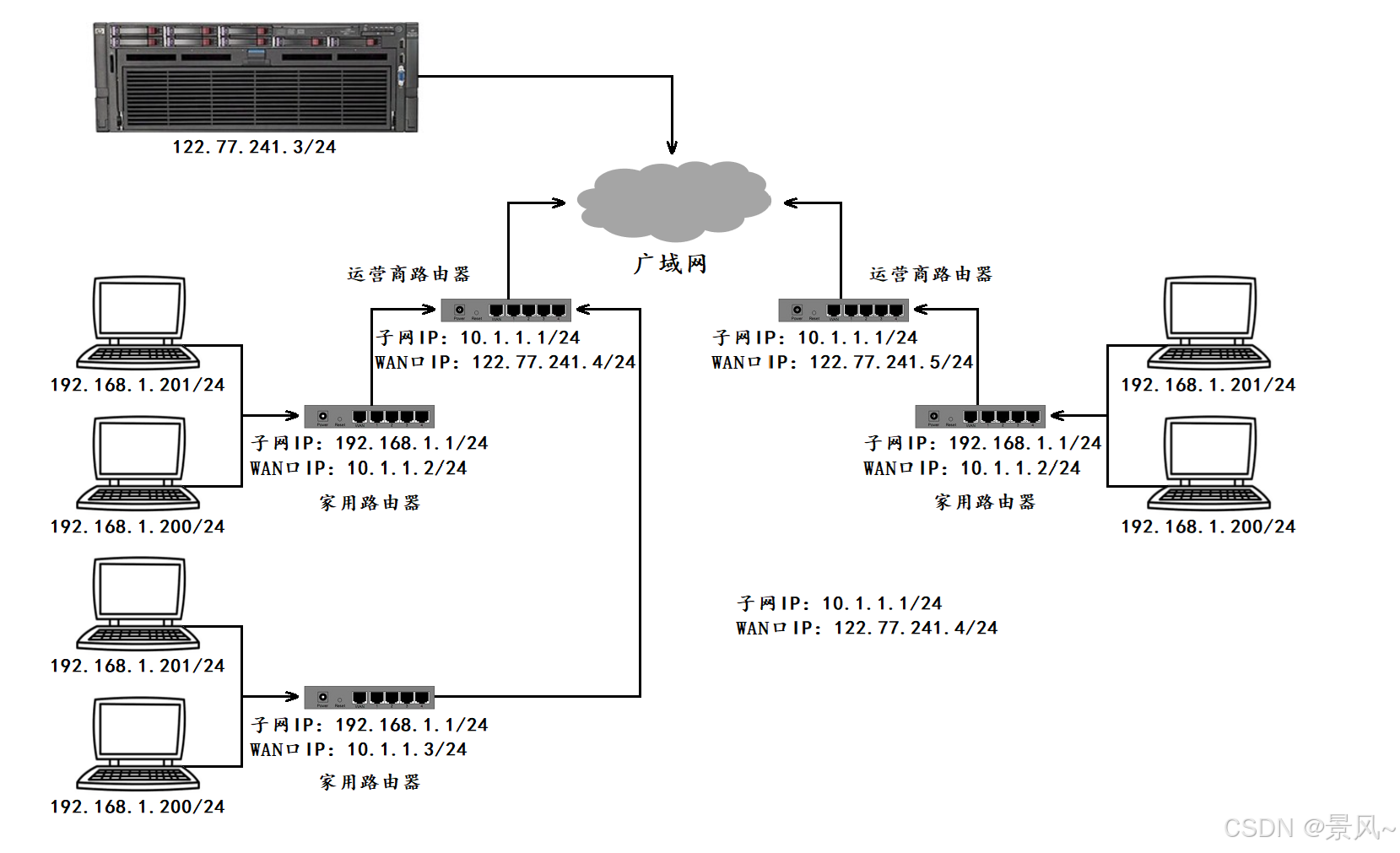 - 每一个家用路由器,其实又作为运营商路由器的子网中的一个节点.这样的运营商路由器可能会有很多级,最外层的运营商路由器,WAN口IP就是一个公网IP了.