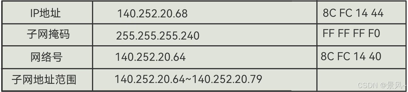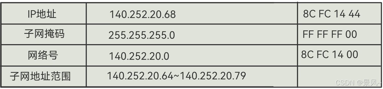 IP 地址和子网掩码还有一种更简洁的表示方法,例如140.252.20.68/24,表示IP地址为 140.252.20.68, 子网掩码的高24位是1,也就是255.255.255.0