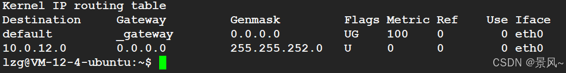 - Flags中,U标志表示此条目有效(可以禁用某些条目)G标志表示此条目的下一跳地址是某个路由器的地址,没有G标志的条目表示目的网络地址是与本机接口直接相连的网络,不必经路由器转发。