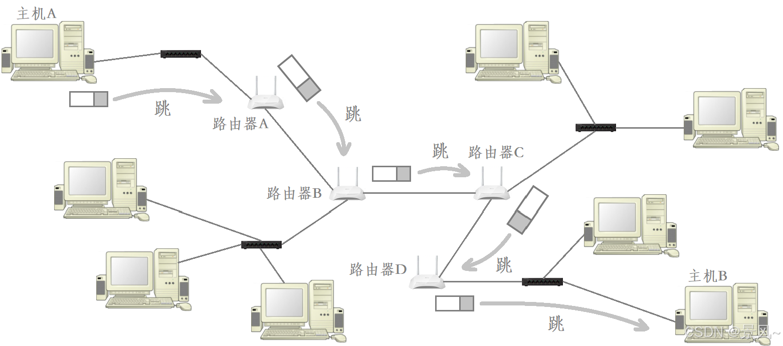数据进行的网络传输一般都是跨网络的,而路由器就是连接多个网络的硬件设备,因此数据在进行跨网络传输时一定需要经过多个路由器。