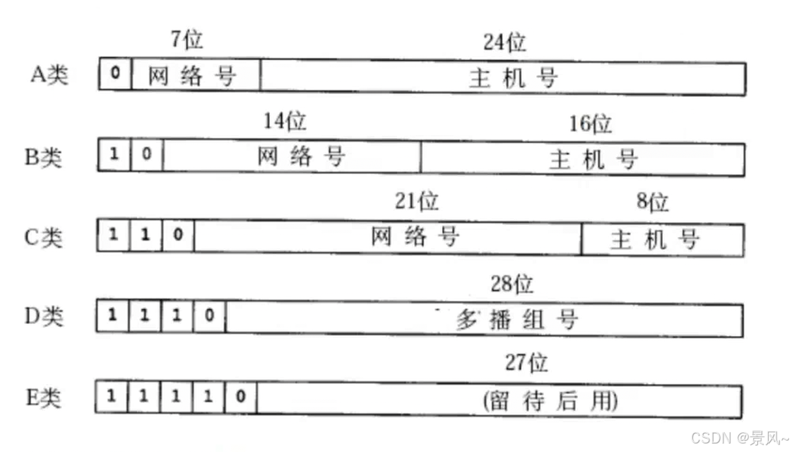 过去曾经提出一种划分网络号和主机号的方案,把所有IP地址分为五类,如下图所示