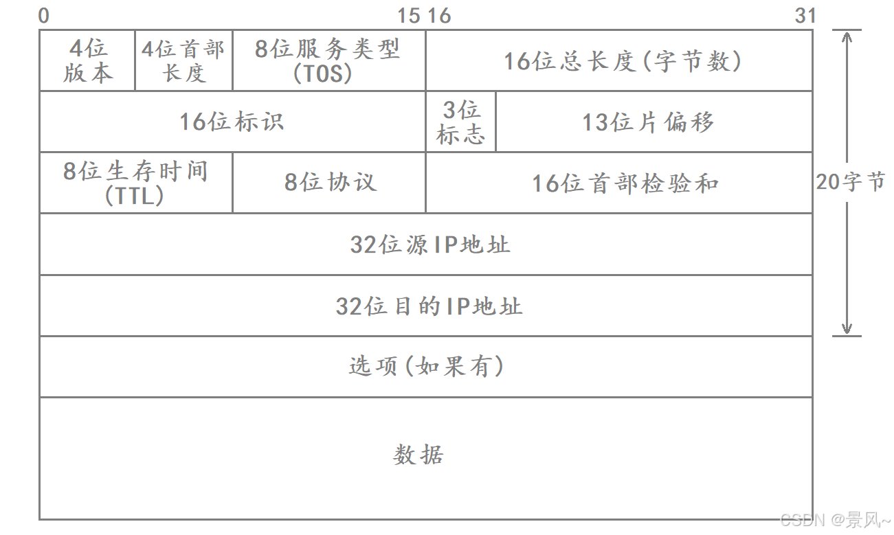 - 32位源IP地址和32位目的IP地址:表示发送端和接收端所对应的IP地址。