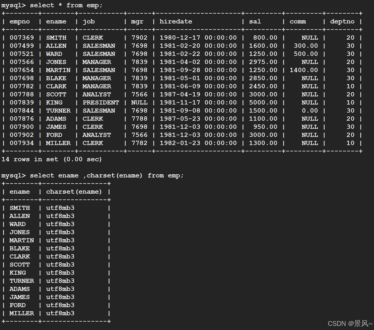 现有如下员工表,要求获取员工表中ename列使用的字符集。