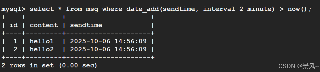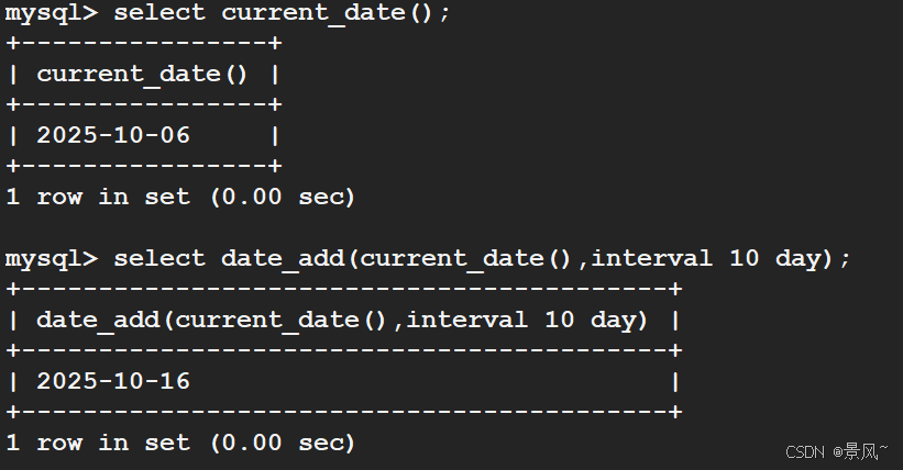 | date_add(date, interval d_value_type) | 在日期 date 上添加指定的时间间隔,interval 后的单位可为:year、month、day、hour、minute、second |