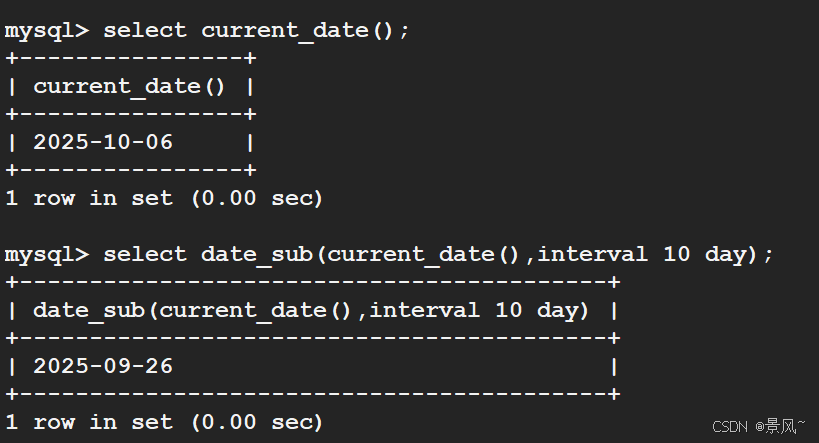 | date_sub(date, interval d_value_type) | 在日期 date 上减去指定的时间间隔,interval 后的单位可为:year、month、day、hour、minute、second |