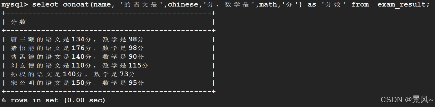 在查询成绩表中的信息时,使用concat函数按要求进行字符串连接即可。如下: