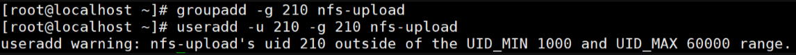 开放/nfs/upload目录,为192.168.xxx.0/24网段主机可以上传目录,并将所有用户及所属的组映射为nfs-upload,其UID和GID均为210