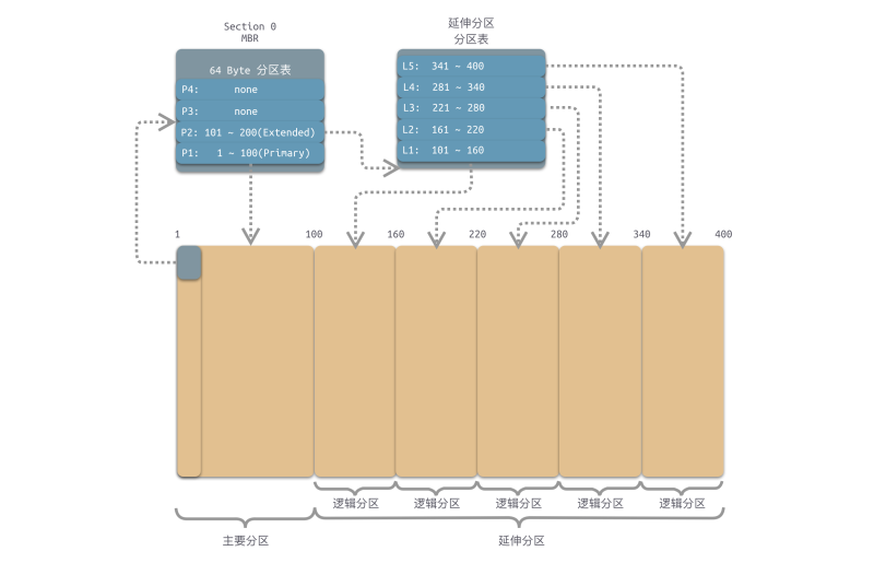 由于分区表只有 64 Bytes,最多只能记录 4 组分区信息,那么是否意味着一个硬盘最多只能分割成 4 个分区呢?当然不是!虽然第一个扇区的分区表只能记录 4 组分区信息,但是利用其中的延伸分区信息进一步索引到一个新的分区表,从而记录更多分区信息。如下图所示: