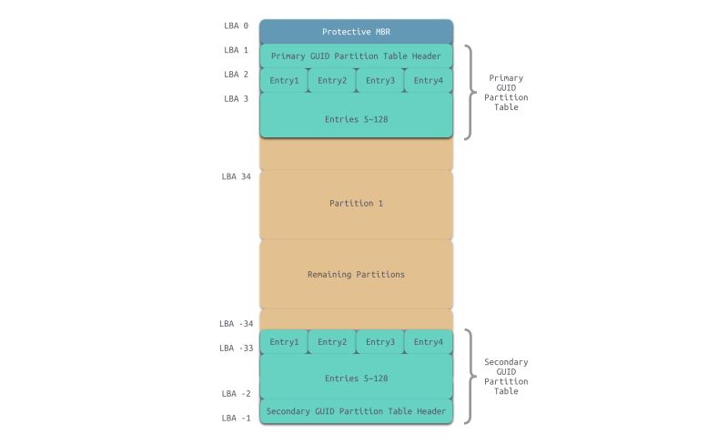 下图所示为 GUID 的结构示意图。与 MBR 使用扇区作为寻址单位不同,GUID 使用 逻辑区块(Logical Block) 作为寻址单位,即采用 LBA(Logical Block Address)寻址方式。MRB 仅使用第一个扇区 512 Bytes 的空间记录分区信息,GUID 则使用 34 个 LBA 区块(每个区块容量默认为 512 Bytes)记录分区信息。MBR 仅有一个扇区保存分区信息,GUID 除了使用硬盘前 34 个 LBA,还是用最后 33 个 LBA 作为备份。