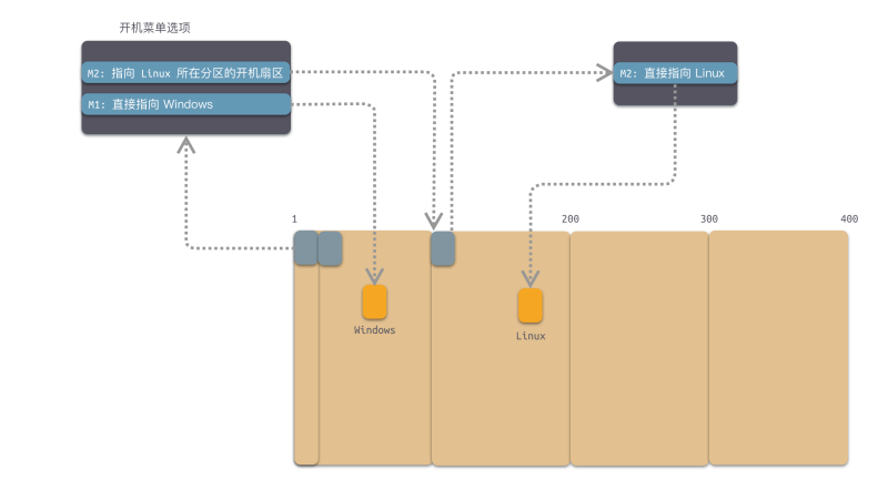 对于第 3 项,表示计算机系统中可能具有两个以上的 boot loader。事实上,boot loader 不仅可以安装在 MBR 中,还可以安装在每个分区的 开机扇区(boot sector) 中。