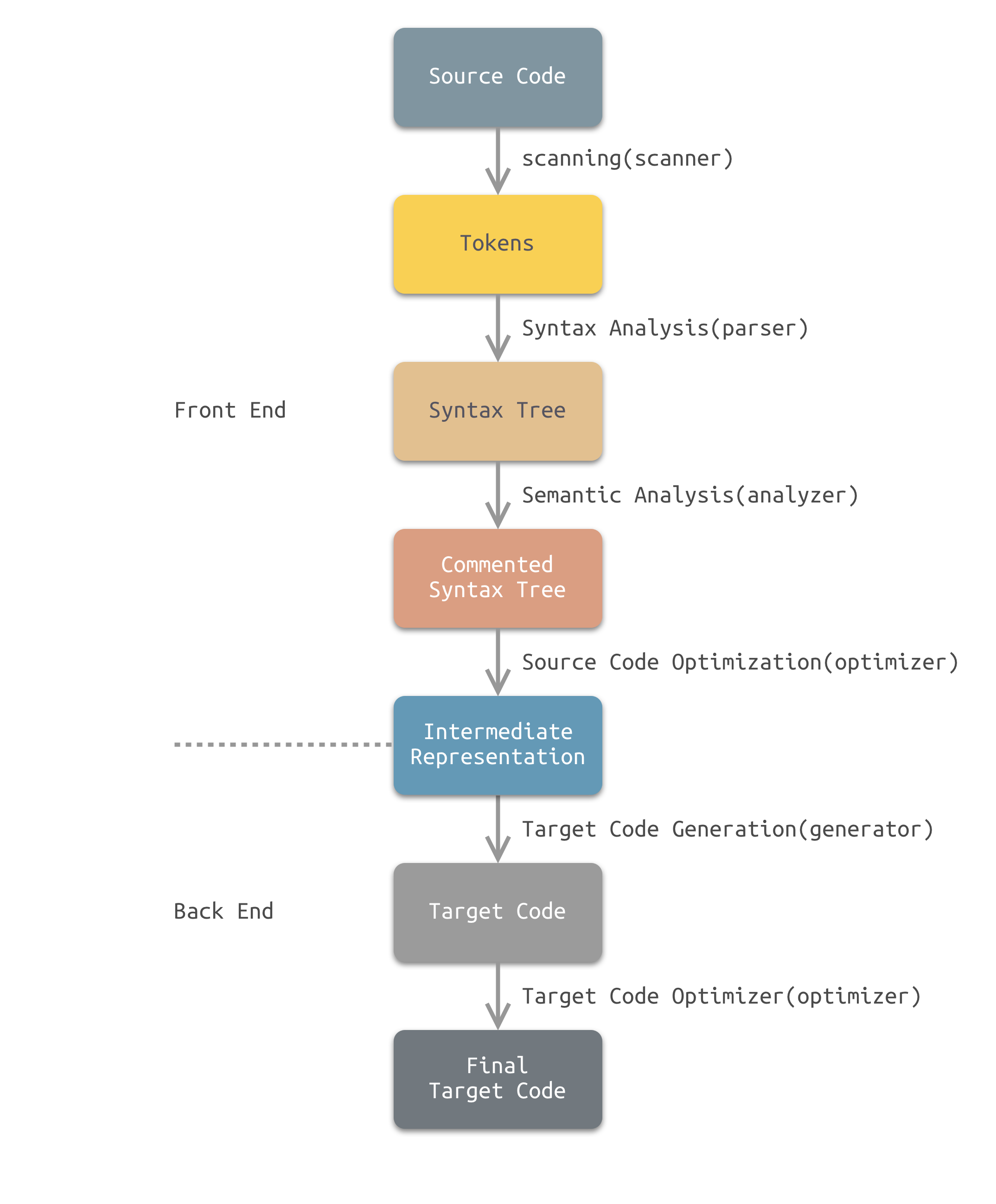 首先源代码被输入到扫描器(Scanner),扫描器的任务很简单,只是简单地进行词法分析,运用一种类似于有限状态机(Finite State Machine)的算法将源代码的字符序列分割成一系列的记号(Token)。