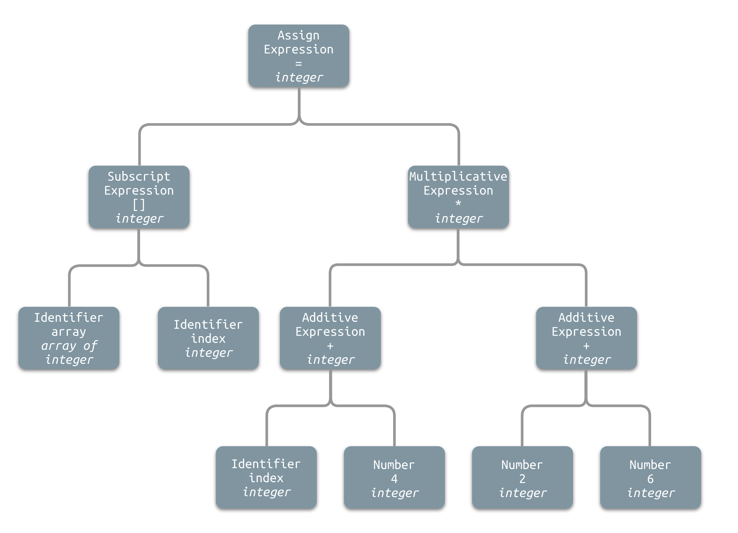 以上述代码为例,其中的语句就是一个由赋值表达式、加法表达式、乘法表达式、数组表达式、括号表达式组成的复杂语句,下图所示为该语句经过语法分析器后生成的语法树。
