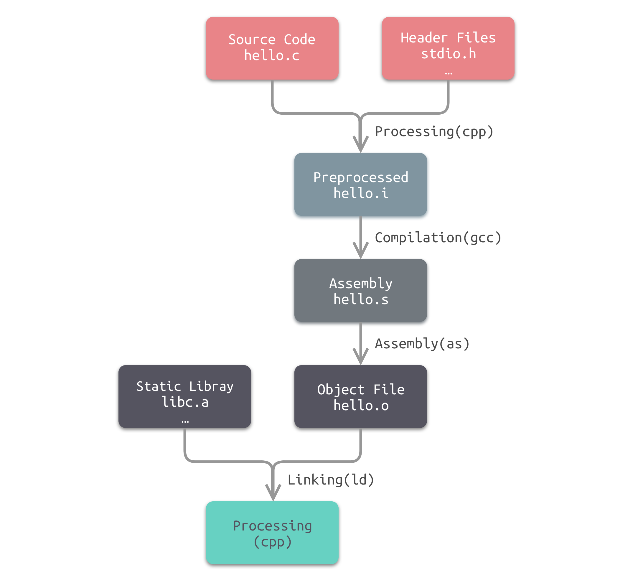GCC编译命令隐藏了构建过程中的一些复杂的步骤,主要有4个步骤,如下图所示。
