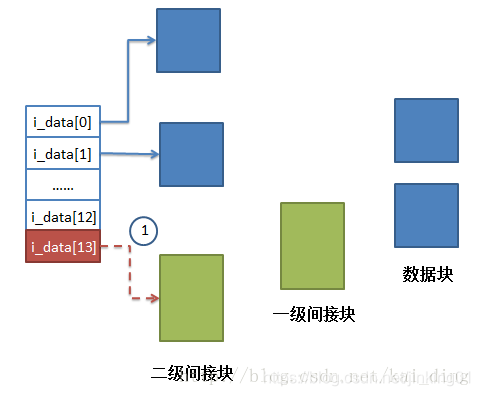 这就是我们目前所处的状态,间接块和数据块也已分配,但这种连接尚未建立起来。文件在i_data[13](即二级索引的起始之处)断链了,接下来我们要做的是就是创建这种连接关系。
