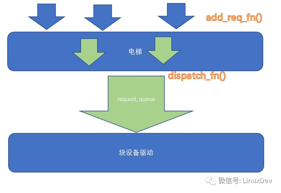 电梯的内部实现可以非常灵活,但是入口是elevator_add_req_fn(),出口是elevator_dispatch_fn()。