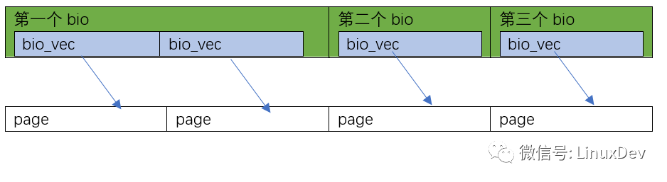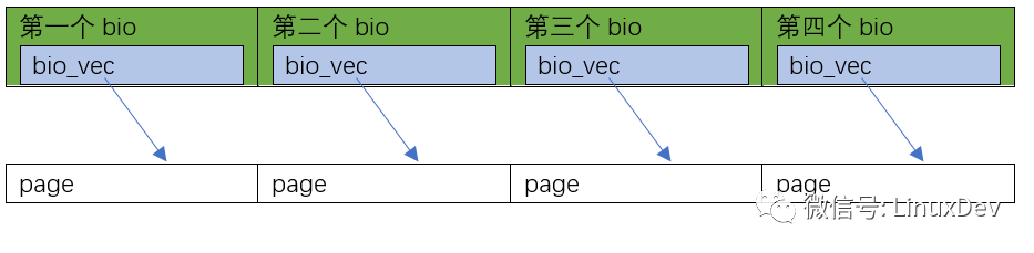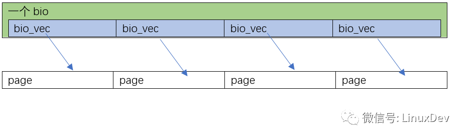 它是一个描述硬盘里面的位置与page cache的页对应关系的数据结构,每个bio对应的硬盘里面一块连续的位置,每一块硬盘里面连续的位置,可能对应着page cache的多页,或者一页,所以它里面会有一个bio_vec *bi_io_vec的表。