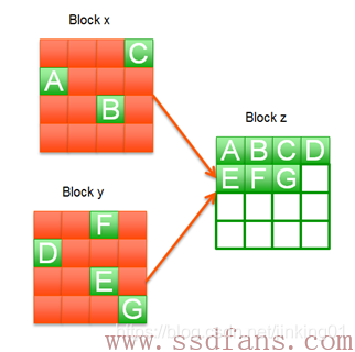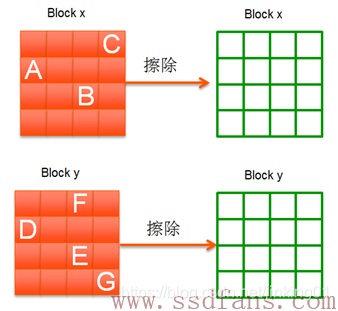 上图中,Block x上面有效数据为A,B,C,Block y上面有效数据为D,E,F,G,红色方块为无效数据。垃圾回收机制就是先找一个未写过的可用Block z,然后把Block x和Block y的有效数据搬移到Block z上面去,这样Block x和Block y上面就没有任何有效数据,可以擦除变成两个可用的Block。