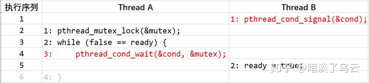 证明一个东西是错的,简单,给出一种错误的 case 就好,如下的执行序列 Thread A 就会丢失 Thread B 的条件变量的唤醒永久 wait,如下表格,在 false = ready 的时候,Thread A 进入 while 循环,但是还没有执行 wait 的时候,(因为没有thread B中没有使用互斥锁锁定临界区,造成了thread B可以随意执行代码;如有有互斥锁锁定了thread B的临界区,则因为thread A和B使用了同一个互斥锁mutex,则thread A在执行1-3的过程中,thread B的1-2无法执行,只能等待在那里,等到thread A中的代码进入到第3行,一旦进入第3行代码,则thread A会原子地释放占用的互斥锁mutex,然后thread B就可以占用mutex了,就可以执行1-2的代码了)thread B 执行了 ready = true 和 signal 唤醒,那么就出现条件变量唤醒 signal 先于 wait,那么相当于 Thread A 还没有被加入唤醒队列(thread A进入pthread_cond_wait()之后,才会加入到待唤醒队列中),这个时候,你已经 signal 唤醒了,那么这次唤醒自然就丢失了(后续如果还调用了唤醒,则能唤醒thread A了,如果不再调用pthread_cond_signal()则thread A就不会再被唤醒,只能永远休眠),执行序列的第 5 行,也就是 Thread 的第 3 行pthread_cond_wait(&cond, &mutex) 就会一直等在那里了。