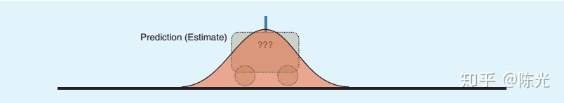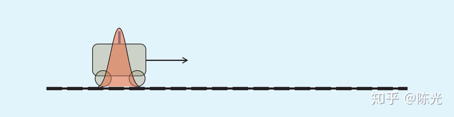 预测是卡尔曼滤波器中很重要的一步,这一步相当于使用历史信息对未来的位置进行推测。根据第1秒小车的位置和速度,我们可以推测第2秒时,小车所在的位置应该如下图所示。会发现,图中红色区域的范围变大了,这是因为预测时加入了速度估计的噪声,是一个放大不确定性的过程。
