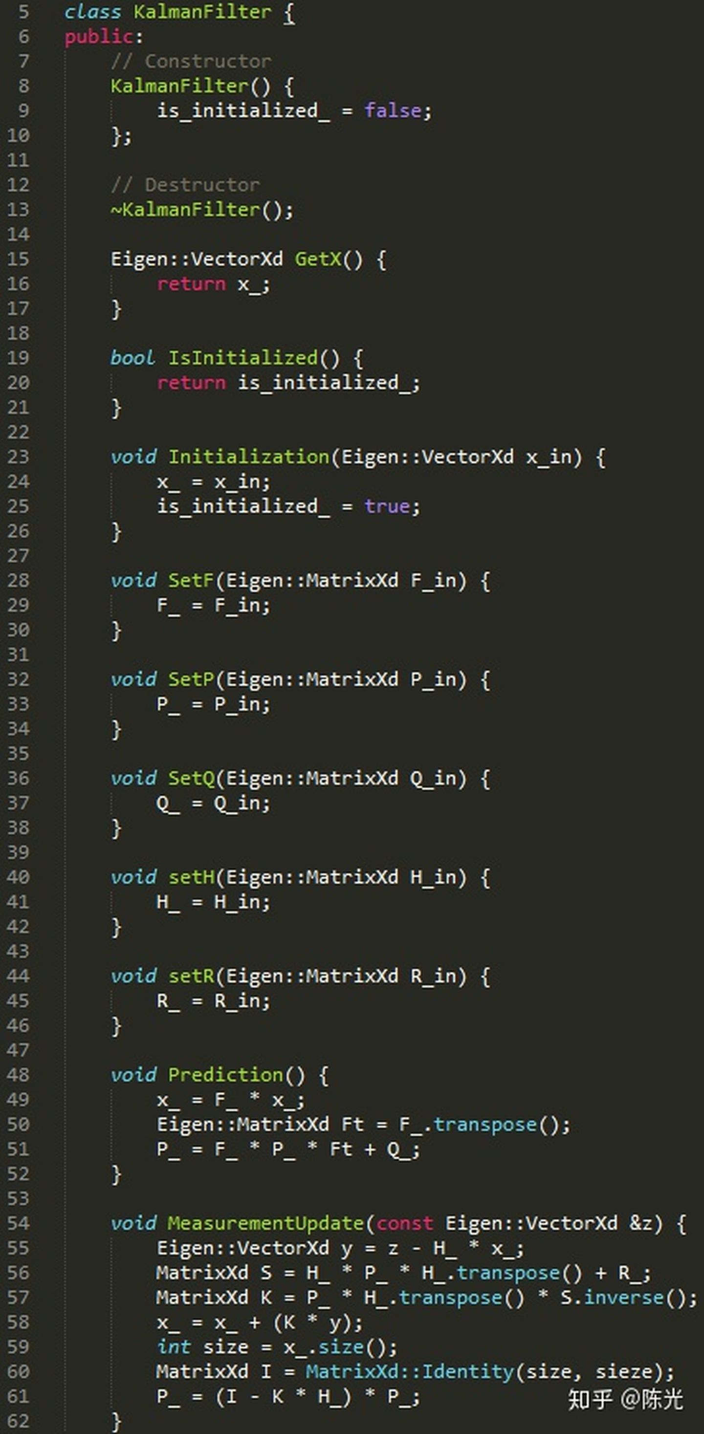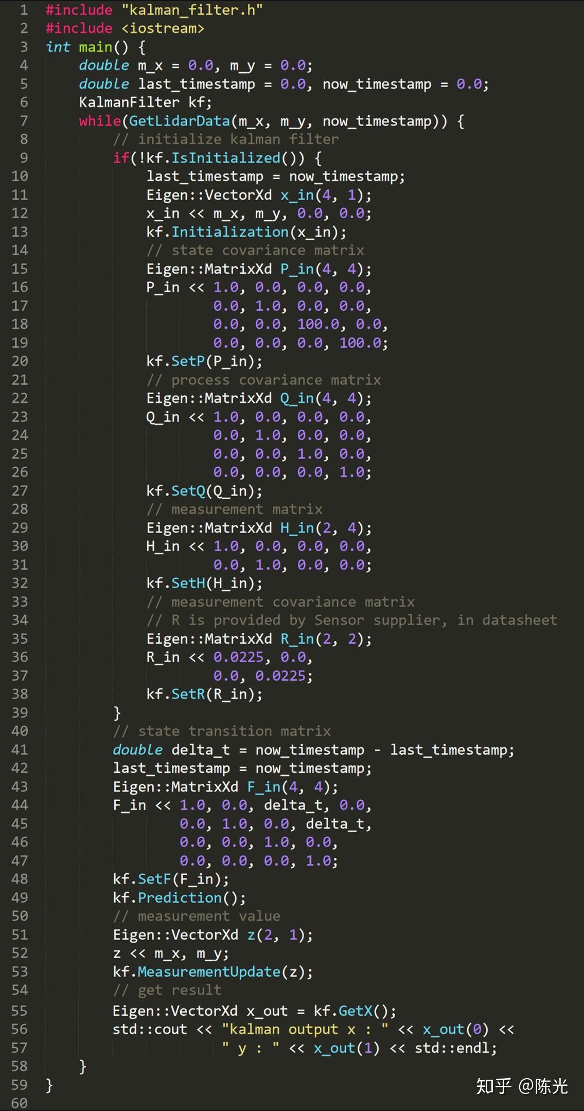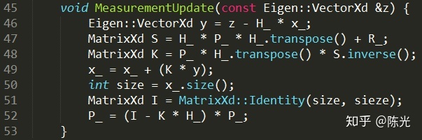 写代码(C++)的过程,实际上就是结合上面的公式,一步步完成初始化、预测、观测的过程。由于公式中涉及大量的矩阵转置和求逆运算,我们使用开源的矩阵运算库——Eigen库。