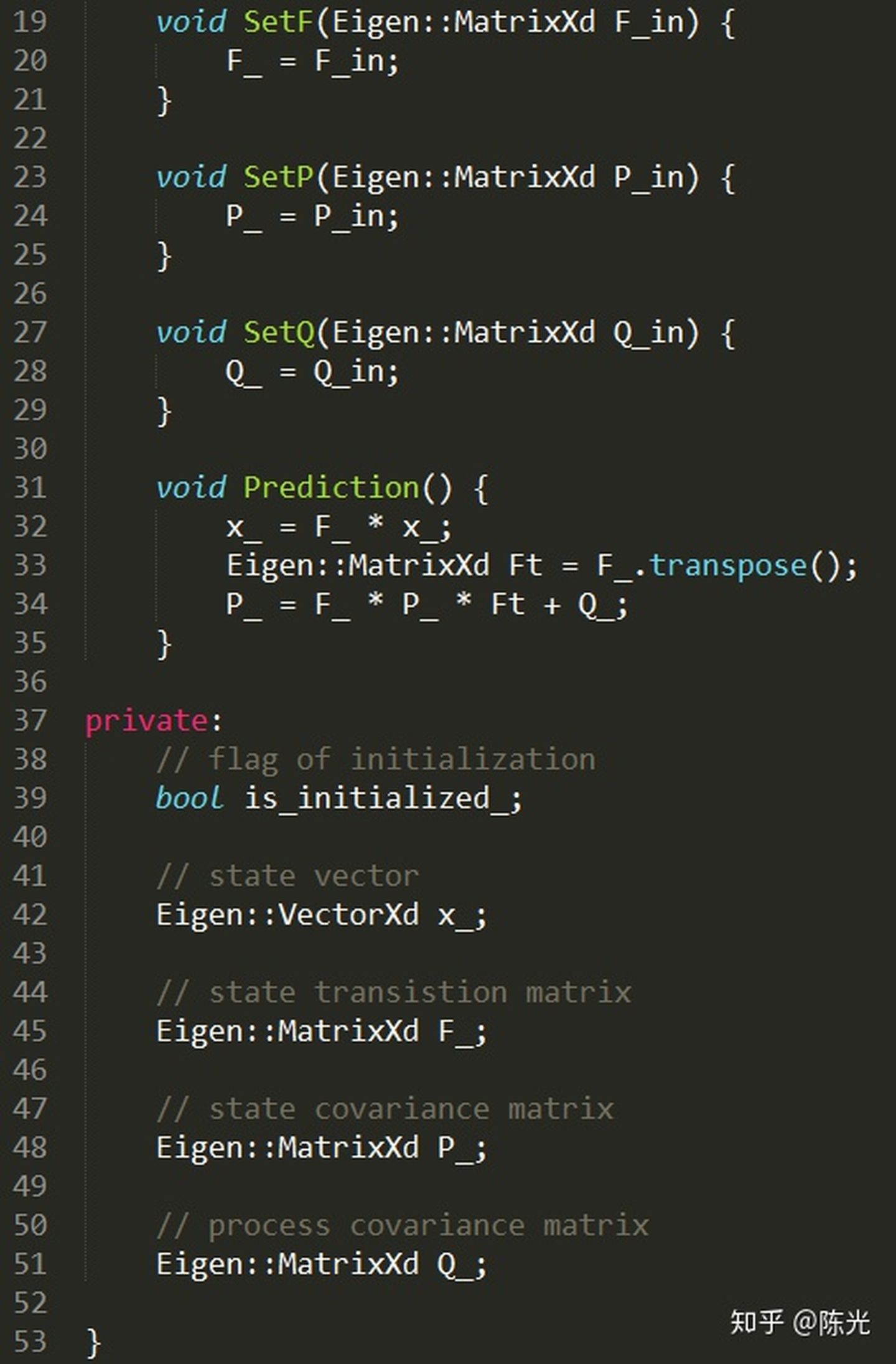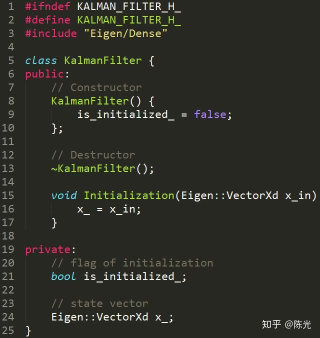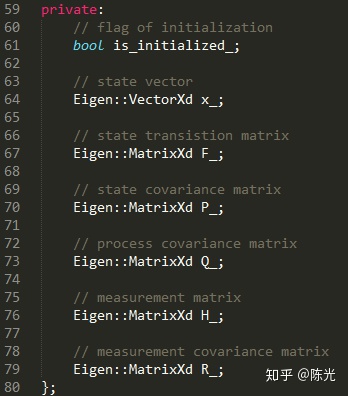 在这里,我们新建了一个KalmanFilter类,其中定义了一个叫做x_的变量,表示这个卡尔曼滤波器的状态向量。