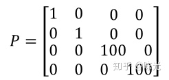 以激光雷达为例。激光雷达只能测量点的位置,无法测量点的速度,因此对于激光雷达的协方差矩阵来说,对于位置信息,其测量位置较准,不确定度较低;对于速度信息,不确定度较高。因此可以认为这里的P为: