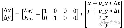 这个公式计算的是实际观测到的测量值z与预测值x'之间差值y。不同传感器的测量值一般不同,比如激光雷达测量的位置信号为x方向和y方向上的距离,毫米波雷达测量的是位置和角度信息。因此需要将状态向量左乘一个矩阵H,才能与测量值进行相应的运算,这个H被称为测量矩阵(Measurement Matrix)。