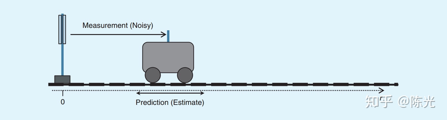 在介绍卡尔曼滤波器数学原理之前,先从感性上看一下它的工作原理。简单来讲,卡尔曼滤波器就是根据上一时刻的状态,预测当前时刻的状态,将预测的状态与当前时刻的测量值进行加权,加权后的结果才认为是当前的实际状态,而不是仅仅听信当前的测量值。