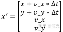 这里的x为状态向量,通过左乘一个矩阵F,再加上外部的影响u,得到预测的状态向量x'。这里的F成为状态转移矩阵(state transistion matrix)。以2维的匀速运动为例,这里的x为