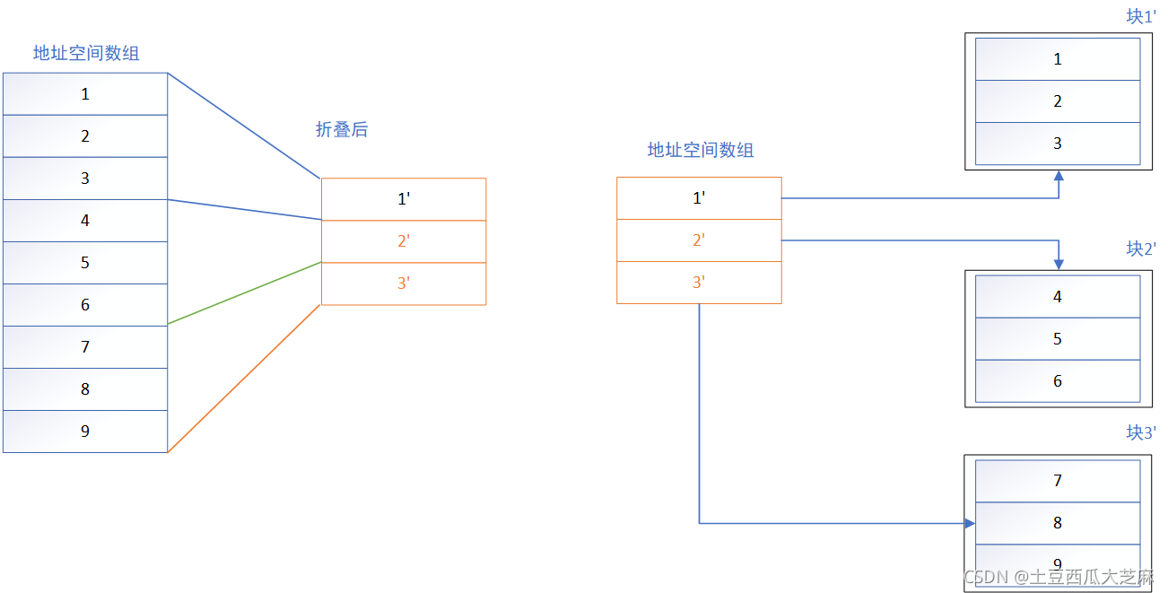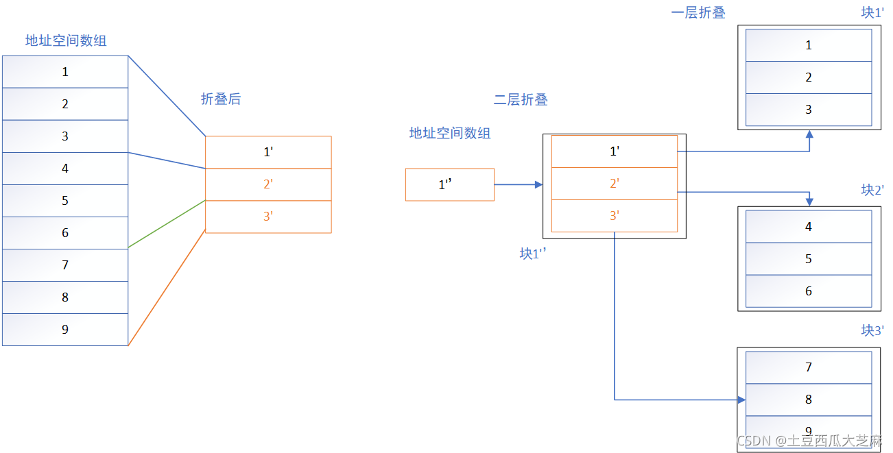 同理,我们可以继续折叠,这样地址空间数组的长度就更小了。折叠粒度越大,则地址空间数组长度越小,但是需要的额外数据块来存储这些不同层的块ID也就越多。