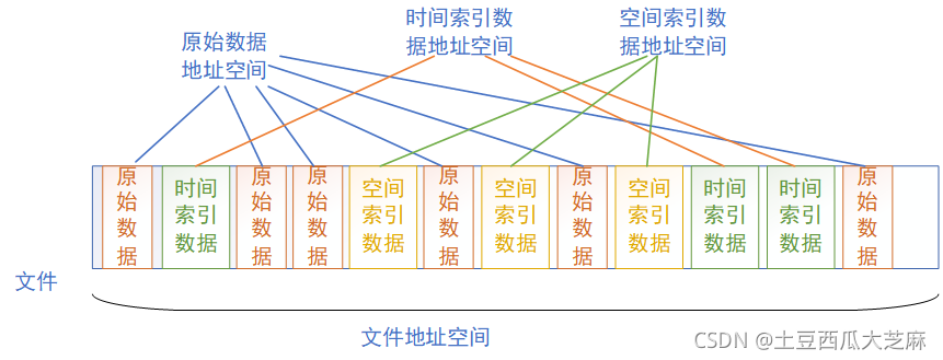 (1)分区存放,先预设一个文件大小,然后进行分区,每个分区放不同的数据。例如,前面放原始数据,后面放时间数据,再后面放空间数据等等。但是这种方案需要预估数据量,一旦预估不准,要么造成空间浪费,要么造成扩展困难。这种方式不现实。