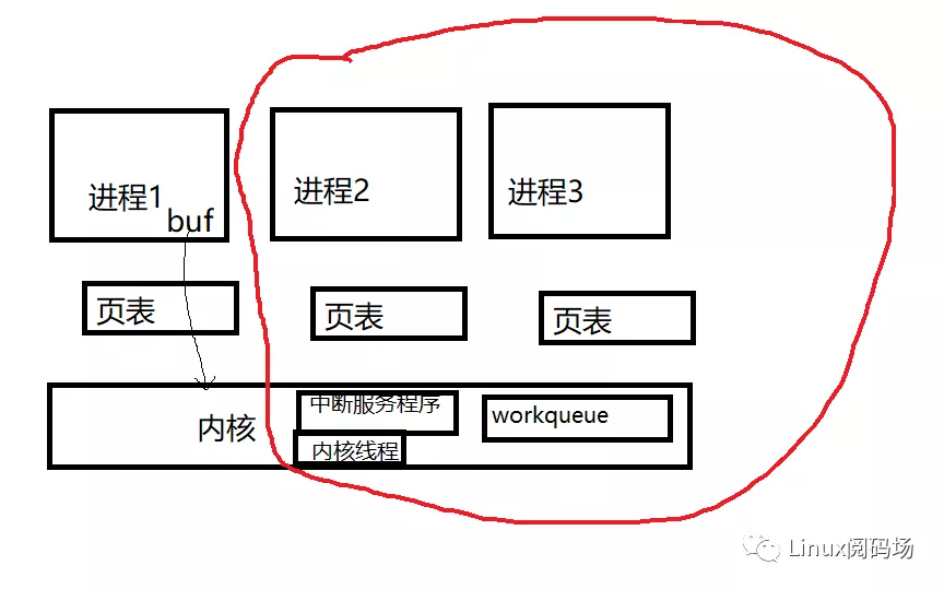 在内核里面直接使用用户态传过来的const char __user * buf指针,是灾难性的,因为buf的虚拟地址,只在这个进程空间是有效的,跨进程是无效的。但是调度一直在发生,中断是存在的,workqueue是存在的,内核线程是存在的,其他进程是存在的,原先的用户进程的buffer地址,切了个进程之后就不知道是个什么鬼!换个进程,页表都特码变了,你这个buf地址还能找着人?进程1的buf地址,在下面的红框里面,什么都不是!