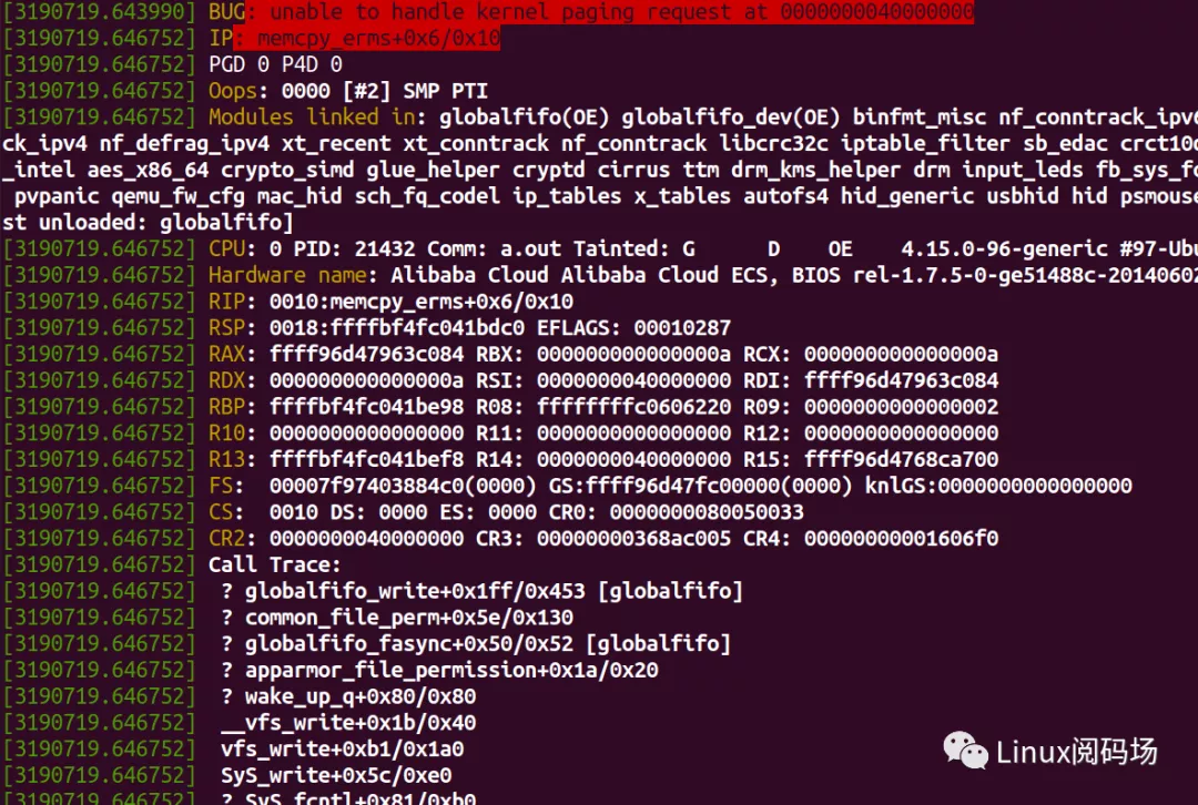 如果内核驱动用memcpy会发生什么呢?我们会看到一段内核Oops: