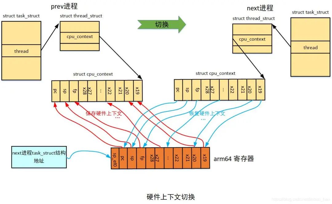 其中x19-x28是arm64 架构规定需要调用保存的寄存器,可以看到处理器状态切换的时候将前一个进程(prev)的x19-x28,fp,sp,pc保存到了进程描述符的cpu_contex中,然后将即将执行的进程(next)描述符的cpu_contex的x19-x28,fp,sp,pc恢复到相应寄存器中,而且将next进程的进程描述符task_struct地址存放在sp_el0中,用于通过current找到当前进程,这样就完成了处理器的状态切换。