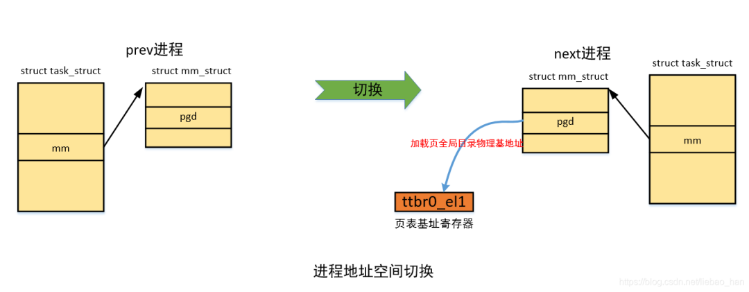 - 地址空间切换将进程自己的页全局目录的基地址pgd保存在ttbr0_le1中,用于mmu的页表遍历的起始点。