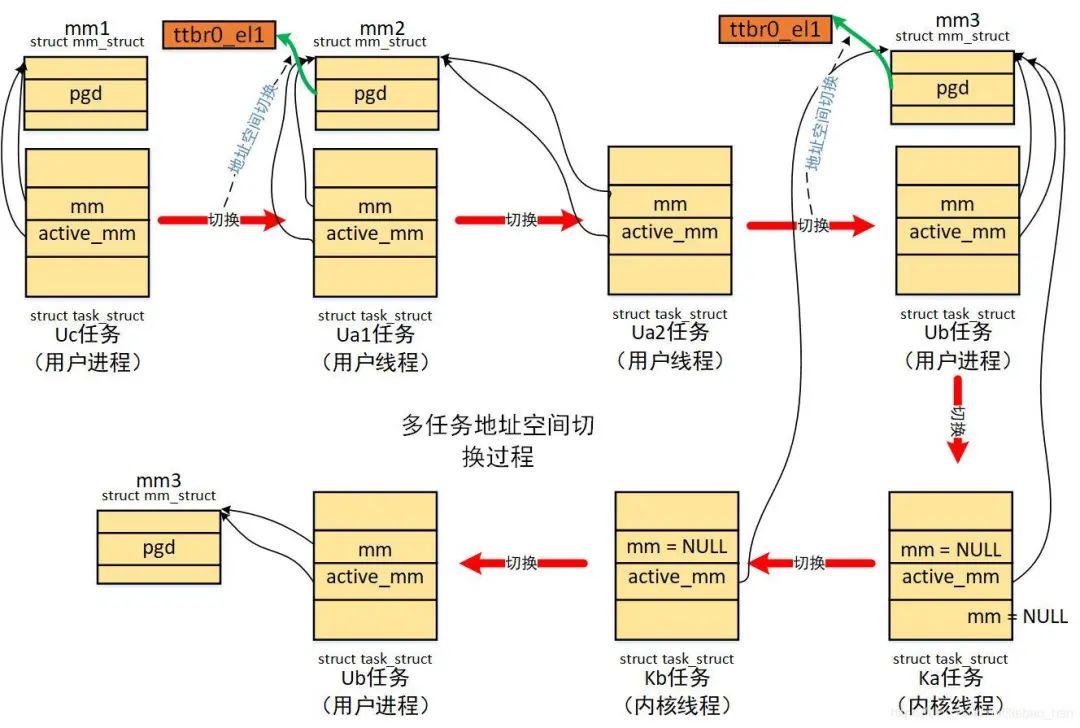 - 从 Ub -> Ka 由于切换到内核线程,所以不需要切换地址空间(Ka借用Ub的mm_struct)。