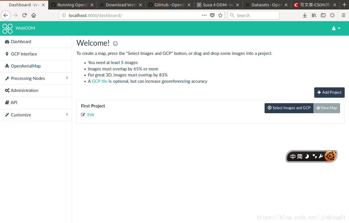 等待半個小時左右,文件下載完畢,打開瀏覽器,輸入localhost:8000,會出現如下界面,表示webODM安裝成功