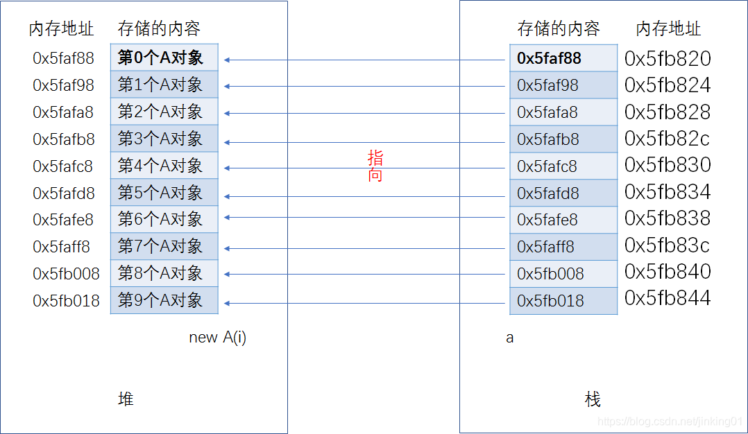 a[i] = new A(i); 的含义:new A()表示定义一个A 对象,并在heap中分配内存空间,并返回一个指向该内存的指针(new返回的是对指针)。 并用a[i]指向他。