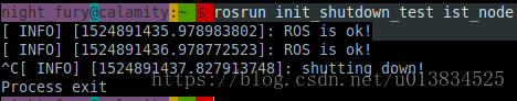 如果5秒内按下了Ctrl+C,则会调用MySigintHandler,然后ros::shutdown();从终端信息我们可以看到,调用ros::shutdown();后,所有ROS服务已经不可以使用,连ROS_INFO也是不能用的,输出信息失败。所以在程序中要密切注意退出部分的程序不要使用ROS的东西。