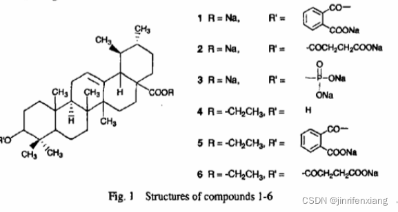 乌索酸属α-香树脂醇(a-amyrin)型或称乌斯烷(Ursane)型五环三萜类化合物,与齐墩果酸互为异构体,不溶于水,其制剂的生物利用度低。为改善其水溶性、增加给药途径,提高药物在体内的生物利用度,对乌索酸进行了结构修饰,在乌索酸C3-OH与多元酸形成单酯,再转化成相应的盐,使其成为可溶于水的前体药物。