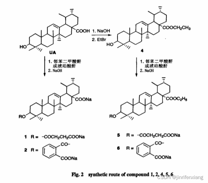 先将熊果酸制成钠盐,再同溴乙烷反应得到熊果酸-28-乙酯(4)。以吡啶为溶剂,熊果酸和熊果酸乙酯与相应的酸酐发生酰化反应,制得3-熊果酸邻苯二甲酸单酯钠盐(1)、3-熊果酸琥珀酸单酯钠盐(2)、熊果酸乙酯-3-邻苯二甲酸单酯钠盐(5)和熊果酸乙酯-3-琥珀酸单酯钠盐(6)。