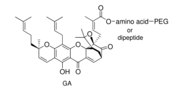 藤黄酸具有较强的抗癌活性,对体外人体肝癌细胞株有杀伤作用和抑制作用;而对正常造血系统和白细胞无影响。为改善天然抗肿瘤活性成份藤黄酸的水溶性,提高其生物利用度,延长体内半衰期等目的,所以构建水溶性聚合物聚乙二醇修饰天然抗肿瘤活性成分藤黄酸的前体药物。