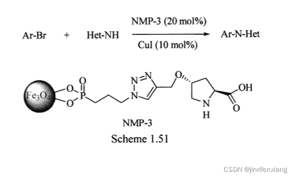 在催化剂循环利用实验中,纳米Fe3O4担载Cu(Ⅰ)/hb-PAMAM配合物循环使用六次后产率仍保持良好。通过向循环反应中补加一定量新的Cu20及Fe3O4-hb-PAMAM,能够使反应产率保持在稳定的范围,实现了催化剂的循环利用。