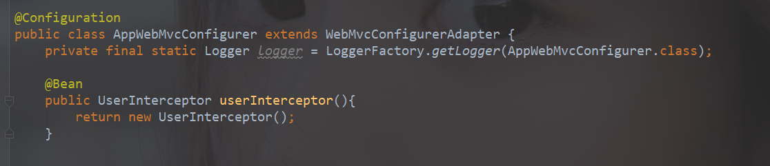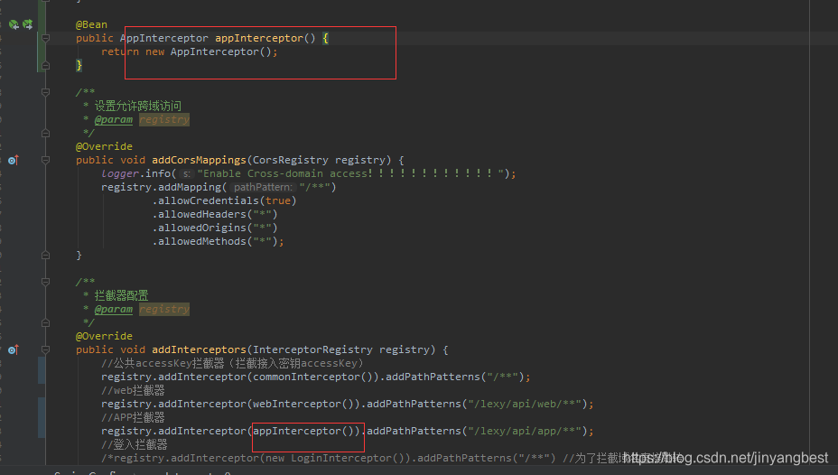 ps:同时在配置拦截器时候,添加拦截器不能使用new AppInterceptor(),而是应该使用@Bean注册的方法,进行方法调用添加到拦截器配置里