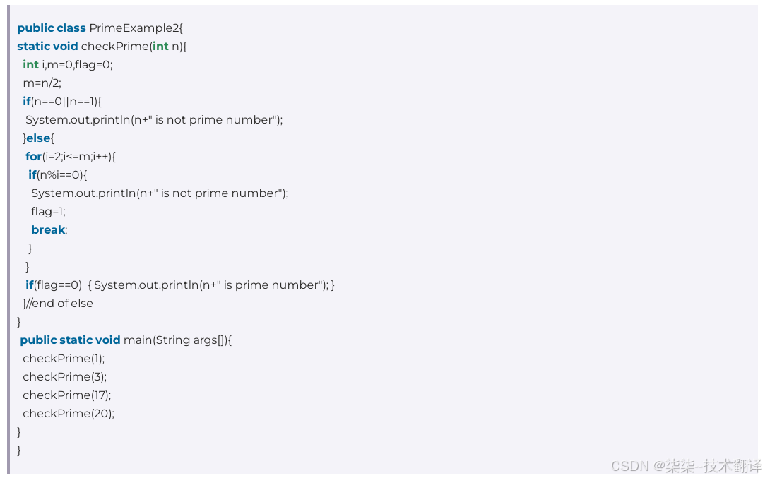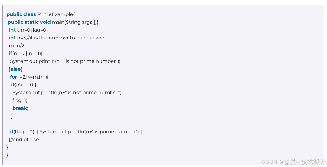 让我们看一下 Java 中的素数程序。在这个 Java 程序中,我们将采用一个数字变量并检查该数字是否为素数。
