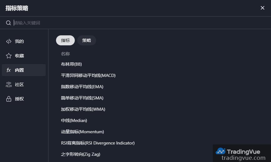 如果您有兴趣在 TradingVue 上使用技术指标或策略,您可以首先探索我们平台上现有的指标。您可以通过两种方式访问平台上的现有指标: