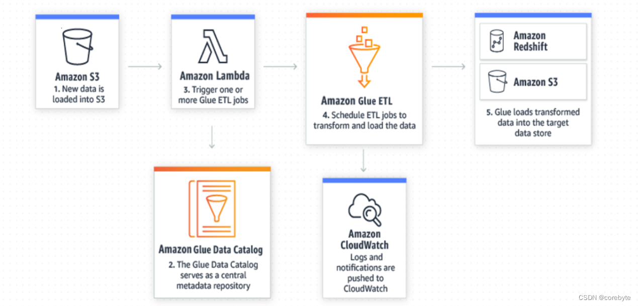 Amazon Glue 是一项完全托管的提取、转换和加载 (ETL) 服务,让客户能够轻松地准备和加载数据以供分析。在亚马逊云科技管理控制台中单击几下鼠标,即可创建并运行 ETL 作业。您只需将 Amazon Glue 指向储存在亚马逊云科技中的数据,Amazon Glue 就会发现这些数据并将关联的元数据(如表定义和 Schema)存储到 Amazon Glue 数据目录中。在存储到目录中之后,您的数据立即可供进行搜索、查询并能用于 ETL。