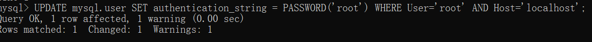 UPDATE mysql.user SET authentication_string = PASSWORD('root') WHERE User='root' AND Host='localhost';