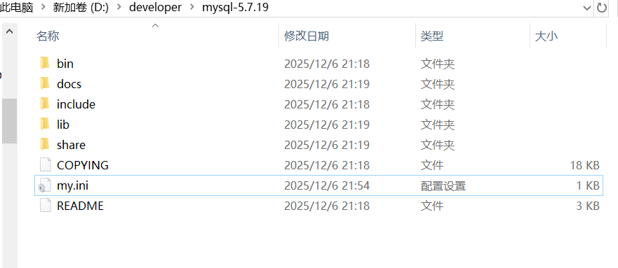 | basedir=D:\developer\mysql-5.7.19\ | 告诉服务器 MySQL 5.7 的程序文件(bin、lib、share 等)放在这个目录。 |