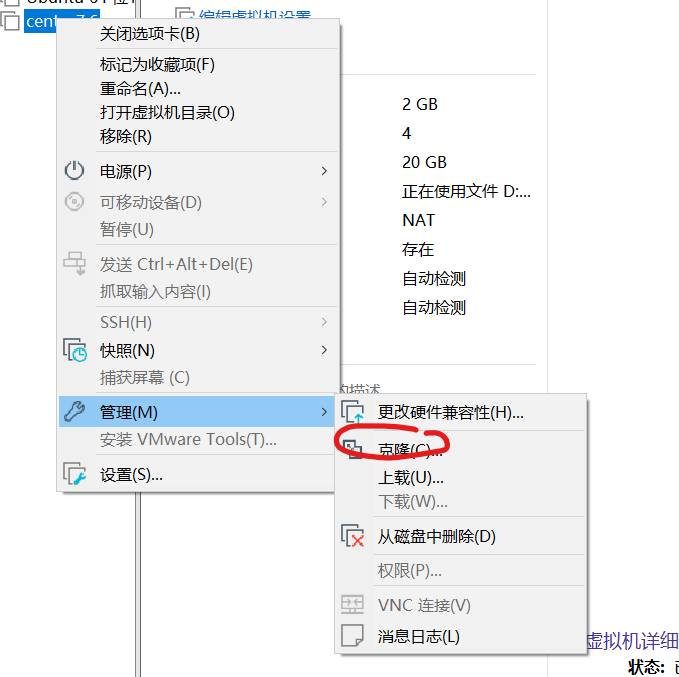 1.右击需要克隆的虚拟机,然后选择 管理 > 克隆